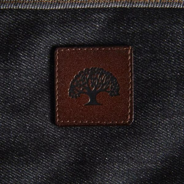 Contrasting blue denim and brown leather stands out in the kitchen